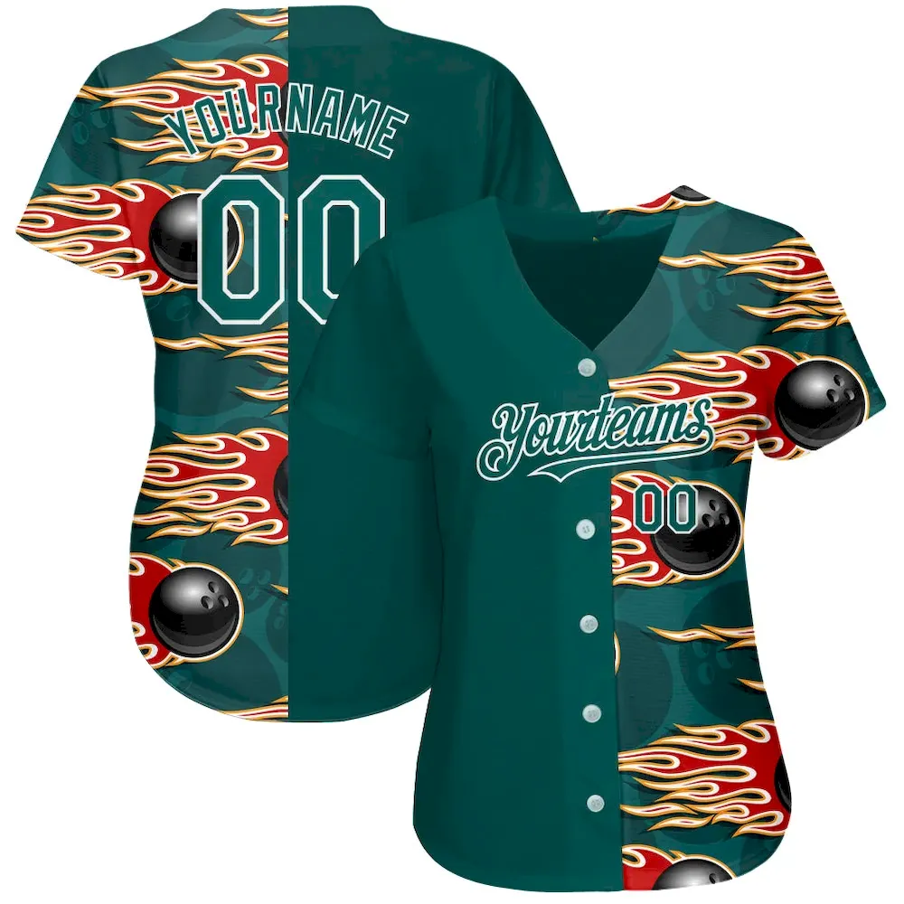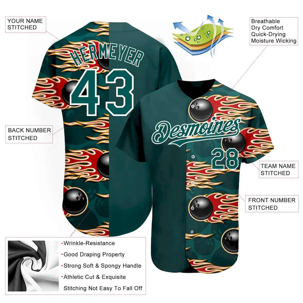 Custom Midnight Green White 3D Pattern Design Bowling Ball With Hotrod Flame Authentic Baseball Jersey