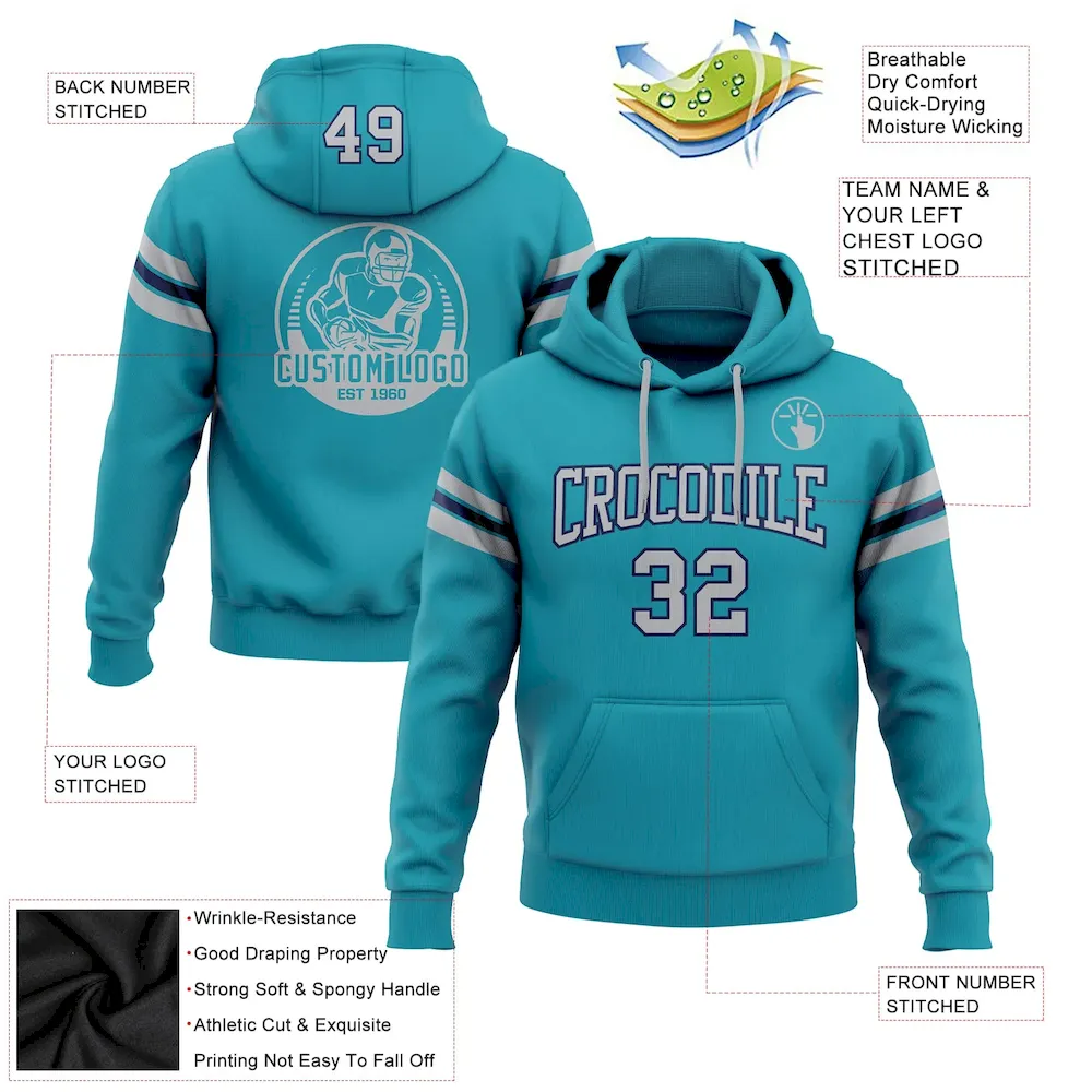 Custom Stitched Teal Gray-Navy Football Pullover Sweatshirt Hoodie